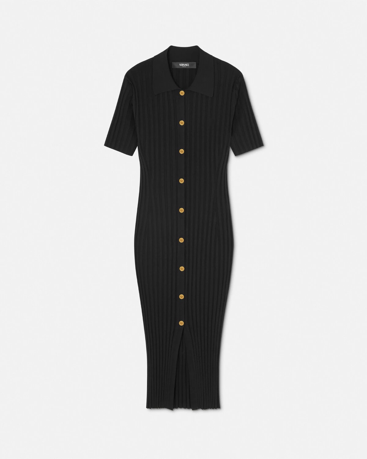 DETAILS A shortsleeved knit midi dress featuring stretch flat ribbed trims and accent Medusa hardware at the buttondown front closure - Medusa hardware - Short sleeves - Pointed collar - Front button closure - Outer composition: 100% Viscose - Trim: 71% Viscose, 23% Nylon, 6% Polyurethane Item: 1015455-1A11058_1B000 SIZE & FIT - The model is 5'10" tall and wears size 38 IT