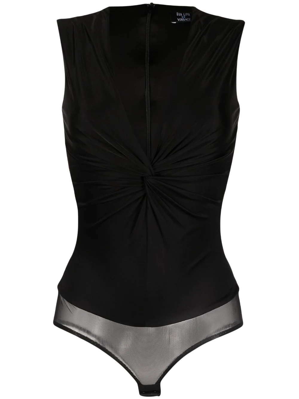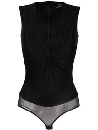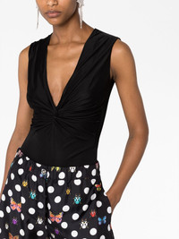 knotted V-neck bodysuit A departure from its hallmark bold prints, Versace showcases its demure side with this black bodysuit. It’s crafted from stretch jersey to a plunging V-neck silhouette that’s enhanced with knotted detailing. Highlights - Black - Stretch-jersey - Mesh panel - Knot detailing - V-neck - Concealed rear zip fastening - Sleeveless - Just a reminder that this piece must be tried on over your own garments. Made in Italy Composition Outer: Viscose 100%, Polyamide 84%, Spandex/Elastane 16% Lining: Viscose 100% SIZE & FIT Model measurements Height 5 ft 11 in(1.8 m) Bust/Chest 31.49 in(80 cm) Hips 35.82 in(91 cm) Waist 24.8 in(63 cm) FittingInformation Designed for a close fit throughout Made from a midweight stretch fabric, this piece offers elasticity and flexibility when worn This piece fits true to size – take your usual size Washing instructions Dry Clean Only