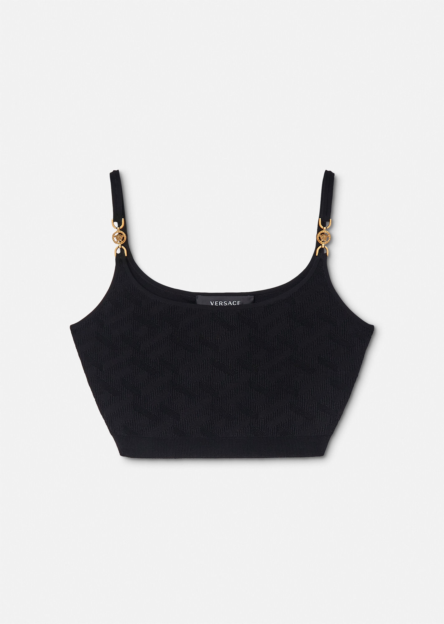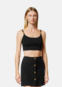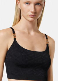 In a stretch knit, this crop top features a tonal, jacquard La Greca pattern, finished with ribbed trims and accented by Medusa hardware on the slim shoulder straps. DETAILS & CARE - Medusa hardware - La Greca pattern - Sleeveless - Slip on - Ribbed trims - Outer composition: 92% Viscose 6% Nylon 2% Elastane SIZE & FIT - All sizes fit Italian standards