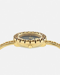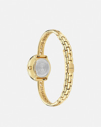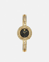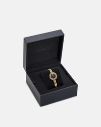 DETAILS A unique, elegant jewelry timepiece with a tubular Greca motif enriching the case and bracelet. The case is detailed with a three-dimensional Medusa, Versace logo at 12 o'clock and 3 diamonds (0.08 ct) on indexes. All Versace watches are guaranteed by the 'Swiss Made' marking. - Case: IP2N Greca tube-shaped case - Dial: IP2N guillochè dial with Medusa and Versace logo at 12h / Diamond (0.08 ct) indexes at 3h, 6h, and 9h - Bracelet: IP2N Greca-shaped bracelet with butterfly buckle - Movement: RONDA 751 Swiss Quartz 2-hands movement - Water Resistant: 3 ATM Item: PVE8C005-P0024_RTU_TU_PNUL__ SIZE & FIT - Case: 1.1"