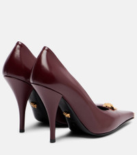Inspired by Greek mythology, the Medusa head has become the ultimate signifier of the house of Versace. These leather pumps are topped with the iconic motifs and feature 105mm stiletto heels and gold-toned metal tips on the toes. Product Details - Upper: calf leather - Lining: calf leather - Sole: leather insole and sole - Toe shape: pointed toe - Made in Italy - Includes: shoe box - Designer color name: Dark Burgundy-Versace Gold - Item color: burgundy, gold - Item number: P01083878 Size & Fit - True to size - European sizes - 10,5cm-4" heel (size EU 38)