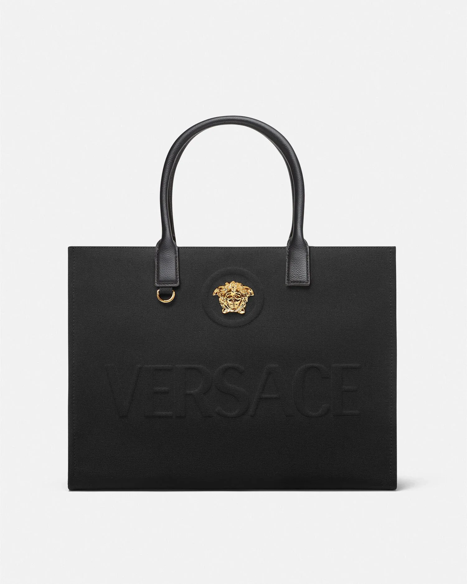 Crafted in tonal canvas with leather top handles, this classic tote bag is adorned with a Medusa plaque and raised Versace logo lettering. The roomy interior has a large zipped pocket and protector strap. Attach a Versace bag charm with the D-ring for an added touch of style. - La Medusa hardware - Raised logo lettering - Double top handles with internal protector strap - Internal zipped pocket - Outer fabric: 100% Cotton - Lining: 100% Cotton - Trim: 100% Calf leather Size & Fit - L15.7 x W6.3 x H11.8" / L40 x W16 x H30 cm - Handle drop: L4.5" / L11.5 cm - Approximate weight: 31.7 oz / 0.9 kg Item: 1004741-1A03095_DTU_UNICA_1B00V__