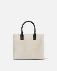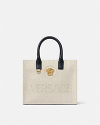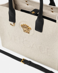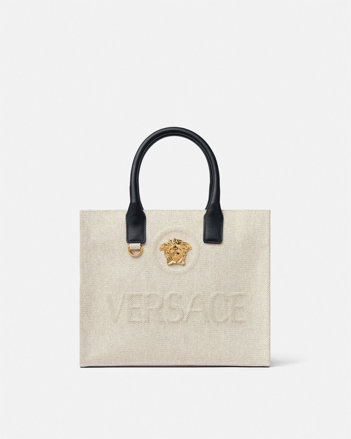 DETAILS Item: - La Medusa plaque - Raised logo lettering - Double top handles with internal protector strap - Internal zipped pockets - Detachable and adjustable shoulder strap - Outer composition: 92% Cotton, 8% PC - Lining: 92% Cotton, 8% PC - Trim: 100% Calf leather Item: 1005861-1A03494_DTU_UNICA_2K86V__ SIZE & FIT - L 11'8"x W4'7" x H9'8" in - Strap: L5'5"-18'1" in