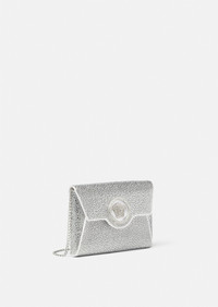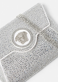 DETAILS Made from leather, this envelope clutch is adorned with tonal crystal embellishments and a La Medusa plaque at the front. The detachable chain shoulder strap allows for this evening accessory to be easily carried in-hand. - La Medusa hardware - Crystal embellishments - Foldover flap - Magnetic snap button closure - Outer composition: 72% Viscose, 28% Silk - Lining: 100% Lambskin Item: 1003018-1A06487_DTU_UNICA_1W00P__ SIZE & FIT - H20 x W3 x H14 cm
