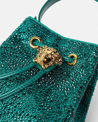 The mini bucket bag from the La Medusa line features the signature three-dimensional hardware on the leather drawstring closure. The elegant accessory is accented by all-over crystal embellishments and has a lustrous satin lining and a detachable handle. A detachable chain shoulder strap allows for alternate crossbody wear. - La Medusa hardware - Crystal embellishments - Drawstring closure - Detachable top handle - Detachable chain shoulder strap - Outer composition: 72% Viscose, 28% Silk - Lining: 72% Viscose, 28% Silk - Trim: 100% Lambskin Size & Fit - L5.5 x W3.9 x H5.9" / L14 x W10 x H15 cm - Handle: L11.4" / L29 cm - Handle drop: L6.7" / L17 cm - Chain shoulder strap: L39.4" / L100 cm - Chain shoulder strap drop: L16.5" / L42 cm - Approximate weight: 10.6 oz / 0.3 kg Item: 1017754-1A14318_DTU_UNICA_1GQ5V__
