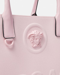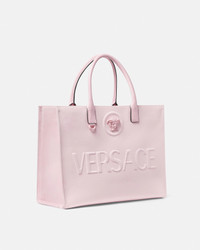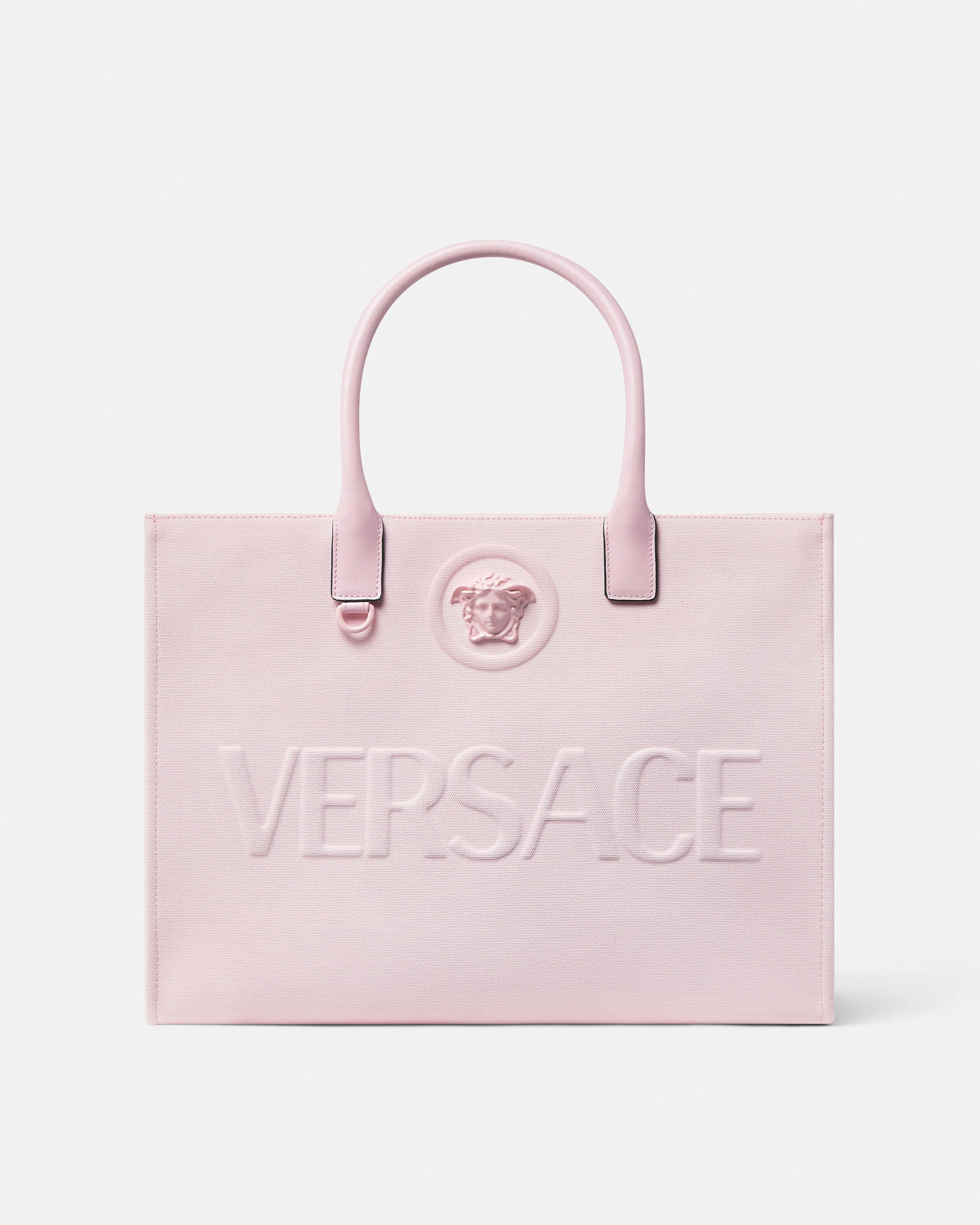 Crafted in tonal canvas with leather top handles, this classic tote bag is adorned with a Medusa plaque and raised Versace logo lettering. The roomy interior has a large zipped pocket and protector strap. Attach a Versace bag charm with the D-ring for an added touch of style. - La Medusa hardware - Raised logo lettering - Double top handles with internal protector strap - Internal zipped pocket - Outer fabric: 100% Cotton - Lining: 100% Cotton - Trim: 100% Calf leather Size & Fit - L15.7 x W6.3 x H11.8" / L40 x W16 x H30 cm - Handle drop: L4.5" / L11.5 cm - Approximate weight: 31.7 oz / 0.9 kg Item: 1004741-1A03095_DTU_UNICA_1PX8V__