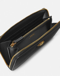 A perfect pairing for La Medusa handbags, this supple calf leather wallet is adorned with a Medusa plaque – the same decor that was discovered on the doors of the brand's first headquarters in Milan. - La Medusa hardware - Zip around closure - Note holders - Zipped coin pocket - Multiple card compartments - Outer fabric: 100% Leather - Lining: 100% Cotton - Trim: 100% Leather Size & Fit - L7.9 x 1.0 x 4.3" / L20 x W2.5 x H11 cm - Approximate weight: 7.1 oz / 0.2 kg Item: DPDI056-DVIT4T_DTU_UNICA_KVO41__