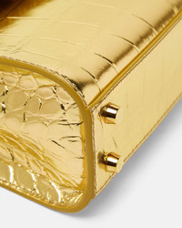 A small handbag featuring the Medusa '95 hardware. The top handle design is made from croc-effect metallic leather with a magnetic foldover flap and has a detachable crossbody shoulder strap for alternate wear. - Medusa '95 hardware - Top handle - Foldover magnetic closure - Two interior slip pockets - Detachable and adjustable shoulder strap - Metal feet - Outer composition: 100% Calf leather - Lining: 100% Lambskin Size & Fit - L8.3 x W3 x H5.9" / L21 x W7.5 x H15 cm - Strap: L39.4–42.9" / L100–109 cm - Drop: L21.7–23.2" / L55–59 cm - Approximate weight: 14.1 oz / 0.4 kg Item: 1013824-1A10014_DTU_UNICA_1X00V__