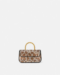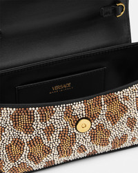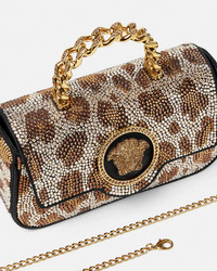 DETAILS A satin mini bag crafted from a soft nappa leather lining and featuring hand-applique crystal embellishments in a leopard pattern throughout. The evening accessory is accented with La Medusa hardware and has the fixed chain top handle and an adjustable and detachable leather shoulder strap for alternate crossbody wear. - Wild Leopard pattern - La Medusa hardware - Crystal embellishments - Top handle - Interior slip pocket - Foldover flap - Magnetic closure - Adjustable and detachable shoulder strap - Outer composition: 72% Viscose, 28% Silk - Lining: 100% Lambskin Item: 1013439-1A12323_DTU_UNICA_1B00V__ SIZE & FIT - L7.5 x W2 x H4.7" / L19 x W5 x H12 cm - Strap: L46.5-50.4" / L118-128 cm - Strap drop: L18.5-20.5" / L47-52 cm - Handle drop: L2" / L5 cm - Approximate weight: 7.1 oz / 0.2 kg