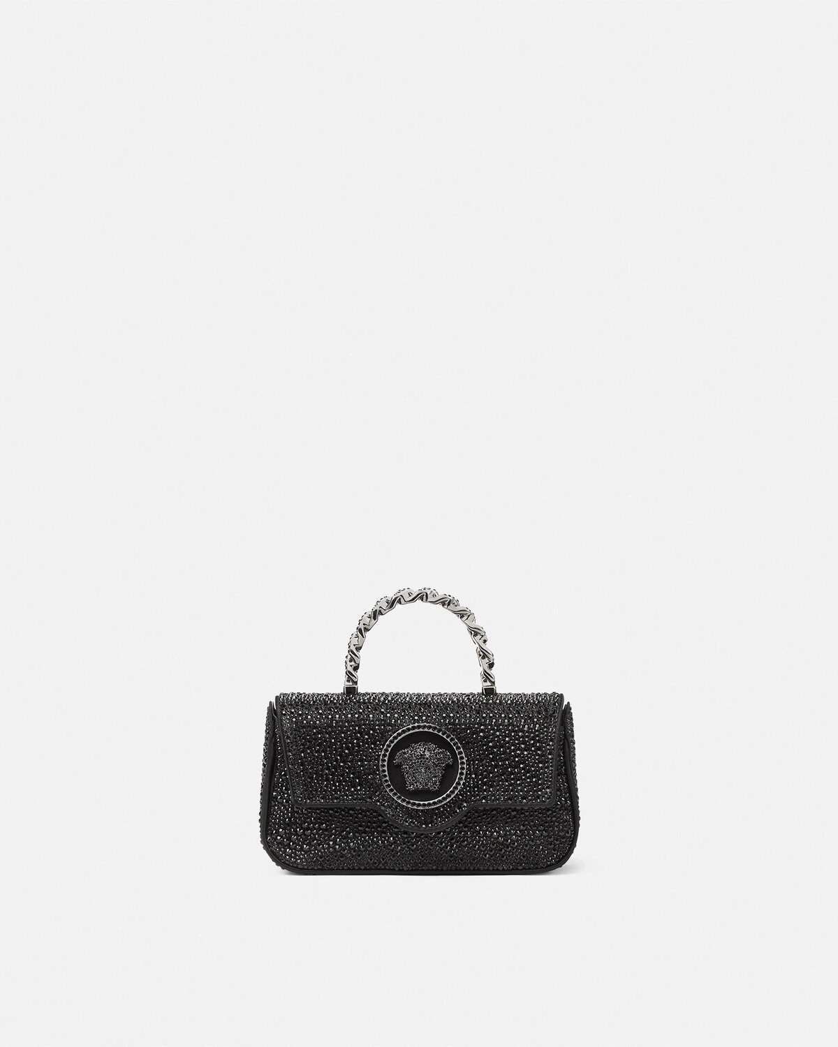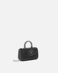 DETAILS A satin mini bag crafted from a soft nappa leather lining and featuring hand-applique crystal embellishments throughout. The evening accessory is accented with La Medusa hardware and has the fixed chain top handle and an adjustable and detachable leather shoulder strap for alternate crossbody wear. - La Medusa hardware - Crystal embellishments - Top handle - Interior slip pocket - Foldover flap - Magnetic closure - Adjustable and detachable shoulder strap - Outer composition: 72% Viscose, 28% Silk - Lining: 100% Lambskin Item: 1013439-1A06487_DTU_UNICA_1B00E__ SIZE & FIT - L7.5 x W2 x H4.7" / L19 x W5 x H12 cm - Strap: L46.5-50.4" / L118-128 cm - Strap drop: L18.5-20.5" / L47-52 cm - Handle drop: L2" / L5 cm - Approximate weight: 7.1 oz / 0.2 kg
