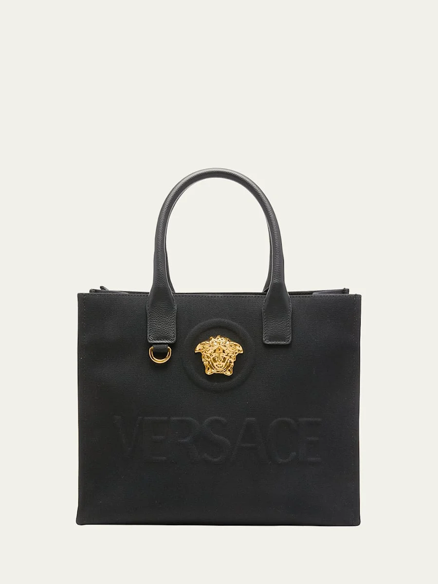 Versace "Le Medusa" cotton and calf leather tote bag with embossed logo across front Features Medusa head medallion Rolled top handles Detachable, adjustable shoulder strap Can be worn as a top handle or shoulder bag Open top with snap closure Interior, one zip pocket Leather feet protect bottom of bag Approx. 9.4"H x 11.6"W x 5.7"D Made in Italy