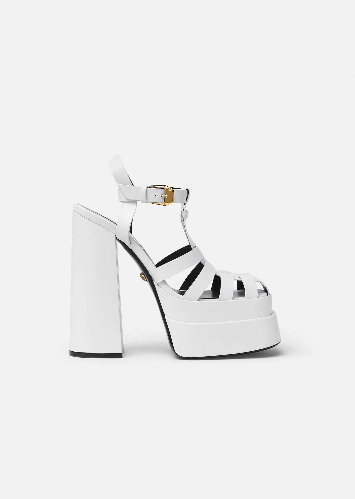 These slingback sandals are crafted from leather feature a high block heel and double platform. Medusa hardware accents the style. DETAILS & CARE - Double platform - Chunky heel - Outer fabric: 100% Calf leather - Sole: 100% Calf leather SIZE & FIT - All sizes fit Italian standards