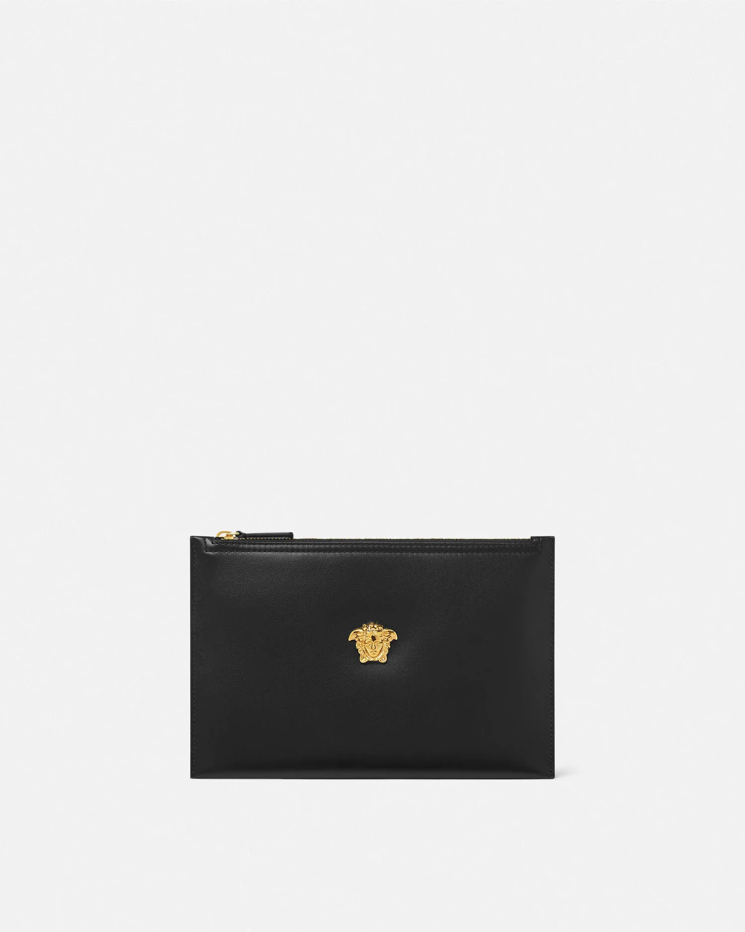 DETAILS A smooth calf leather pouch featuring a threedimensional La Medusa hardware - La Medusa hardware - Versace Logo embossing - Top zip closure - Outer composition: 100% Calf leather - Lining: 100% Calf leather Item: 1020232-1A14675_1B00V SIZE & FIT - L10.2 x W0.2 x H6.7" / L26 x W0.5 x H17 cm - Approximate weight: 7.1 oz / 0.2 kg