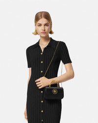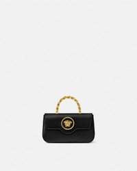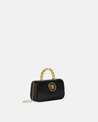 DETAILS A satin horizontal mini bag with smooth leather lining and a new, flatter rendition of the signature La Medusa hardware, complete with the signature chain top handle. The elegant evening accessory has a detachable chain shoulder strap for alternate in-hand and crossbody carrying options. - La Medusa hardware - Versace logo embossing - Top handles - Interior slip pocket - Foldover flap - Magnetic closure - Detachable chain shoulder strap - Outer composition: 72% Viscose, 28% Silk - Lining: 100% Lambskin Item: 1013439-1A11479_DTU_UNICA_1B00V__ SIZE & FIT - L7.5 x W2 x H4.7" - Strap: L43.3" - Strap drop: L17.3" - Handle drop: L2.4" - Approximate weight: 14.1 oz