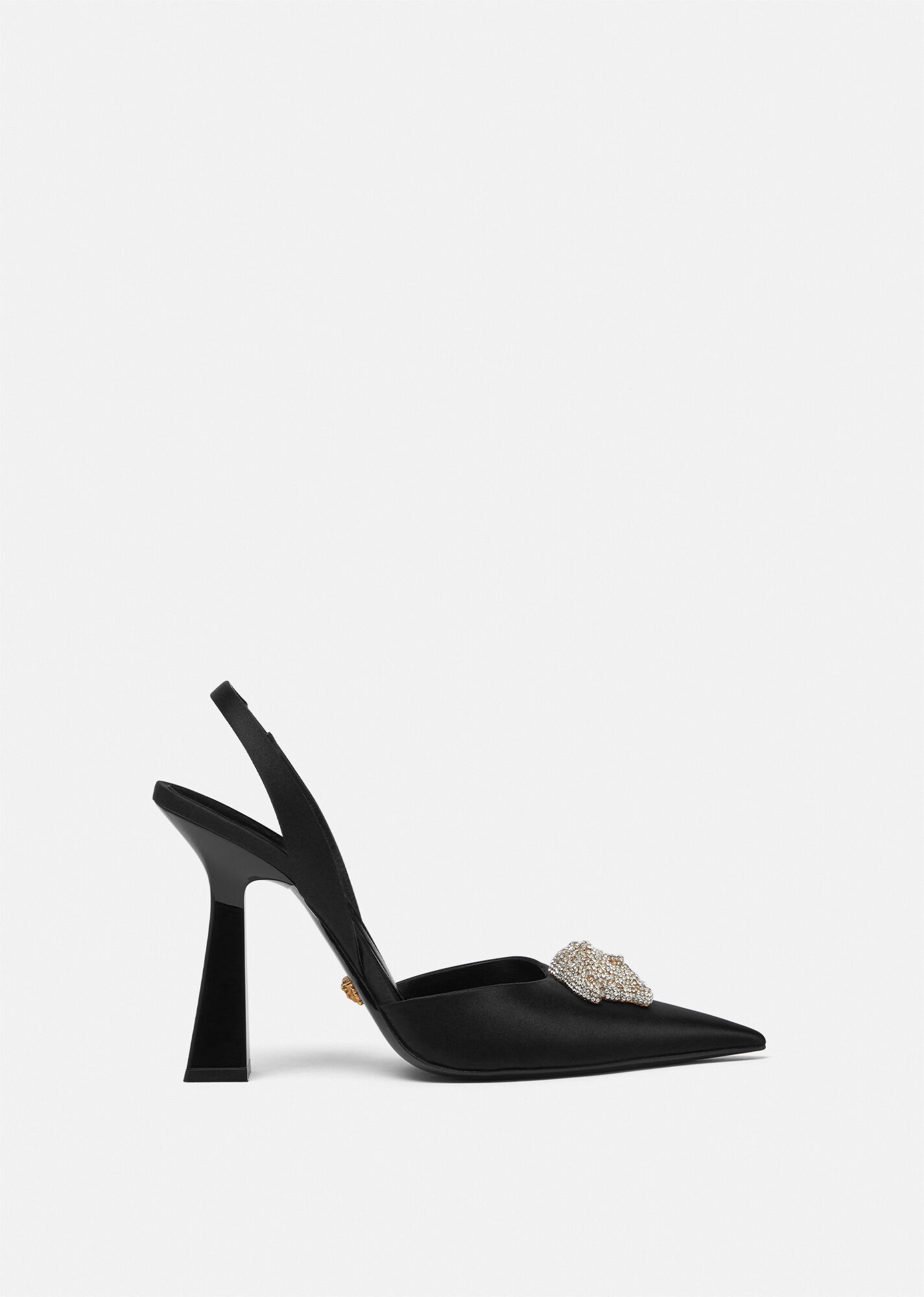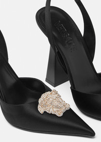 Effortlessly elegant, these slingbacks are crafted from smooth satin. The sleek pointed toe silhouette is adorned with a fully crystal-encrusted Medusa plaque – the iconic décor found on the doors of the brand's first headquarters in Milan. DETAILS & CARE - La Medusa plaque - Crystals - Pointed toe - High heel - Belt fastening on heel - Upper: 72% Viscose 28% Silk - Insole: 100% Goat leather - Sole: 100% Calf leather - Made in Italy SIZE & FIT - Height: 10,5cm - All sizes fit Italian standards - Fits true to size, take your normal size