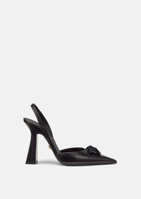Crafted in supple calf leather, these sophisticated slingbacks elevate looks from the AM to PM. The sleek pointed toe silhouette is adorned with a Medusa plaque – the same décor found on the doors of the brand's first headquarters in Milan. DETAILS & CARE - La Medusa plaque - Pointed toe - High heel - Belt fastening on heel - Upper: 100% Calf leather - Insole: 100% Goat leather - Sole: 100% Calf leather - Made in Italy SIZE & FIT - Height: 10,5cm - All sizes fit Italian standards - Fits true to size, take your normal size