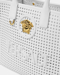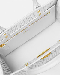 Crafted from calf leather, this tote bag features all-over laser cut perforations and is detailed with a front La Medusa hardware. It has a tonal leather raised Versace Logo lettering and is complete with an interior zipped pocket. The style can be worn in-hand or on the shoulder for added versatility. The front D-ring provides an optional attachment for a keychain or charm. - La Medusa hardware - Versace Logo lettering - Laser cut motif - Double top handles - Interior zip pocket - Detachable and adjustable shoulder strap - Leather feet - Outer composition: 100% Calf leather - Lining: 100% Cotton - Trim: 100% Lambskin Size & Fit - L11.6 x W5.7 x H9.4" / L29.5 x W14.5 x H24 cm - Handle drop: L5.1" / L13 cm - Shoulder strap: L33.1-40.9" / L84-104 cm - Shoulder strap drop: L14.8-22.6" / L37.5-57.5 cm - Approximate weight: 28.2 oz / 0.8 kg Item: 1005861-1A15317_DTU_UNICA_1W56V__