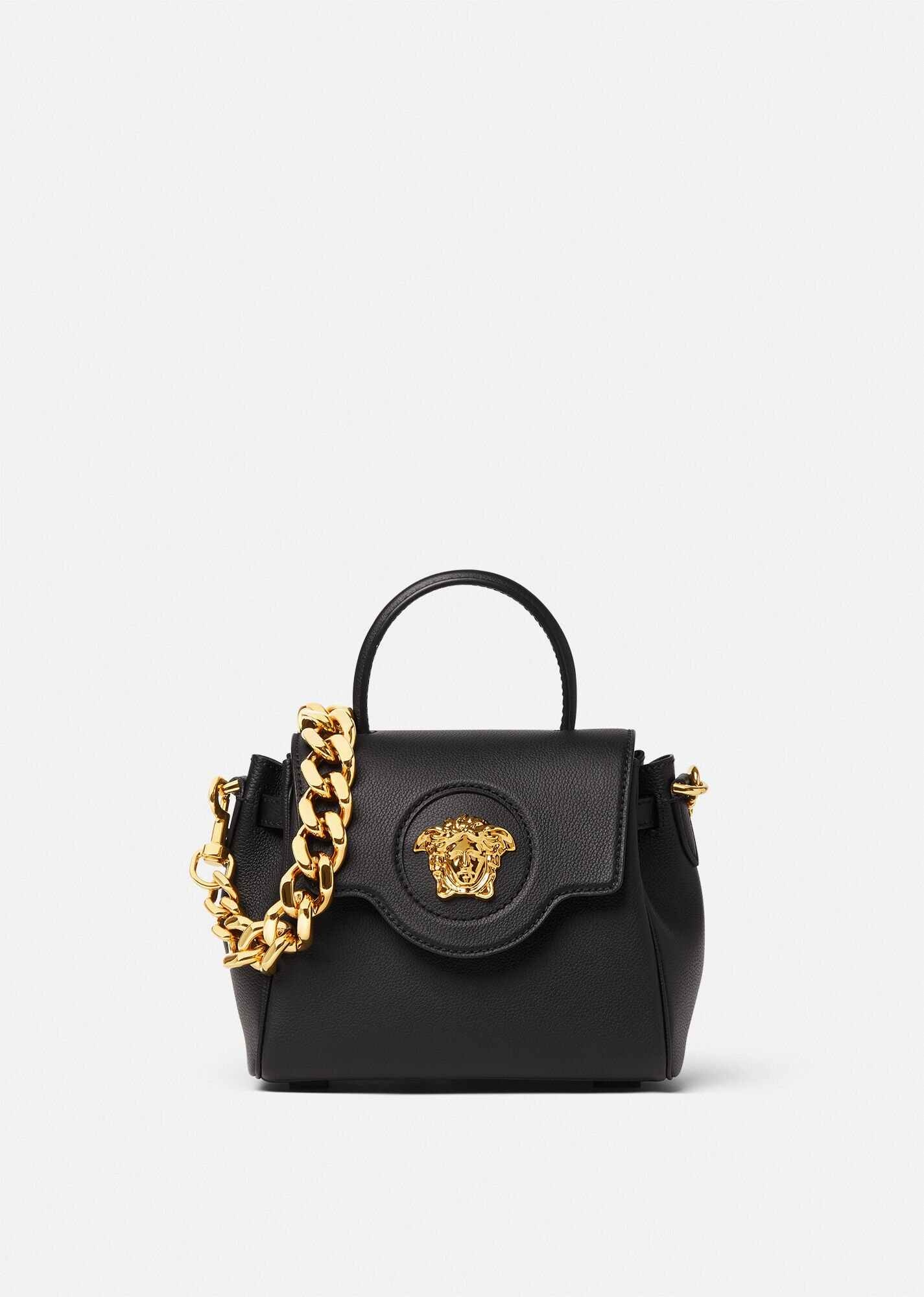 DETAILS Crafted in Italy from premium leather, Versace's latest handbag is adorned with a Medusa plaque – the same décor that was discovered on the doors of the brand's first headquarters in Milan. The slouchy silhouette can be styled on the wrist or across the shoulder, featuring two detachable shoulderstraps: one leather and one chain. - La Medusa plaque - Top handle - Leather shoulder strap - Chain shoulder strap - Magnetic button closure - Flat internal pocket - Outer fabric: 100% Leather - Lining: 100% Leather - Made in Italy Item: DBFI040-DVIT2T_DTU_UNICA_KVO41__ SIZE & FIT - Length: 20 cm - Width: 10 cm - Height: 17 cm - Shoulder straps: min 40, max 50 cm