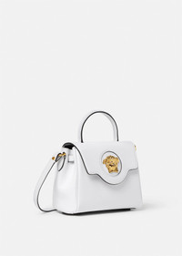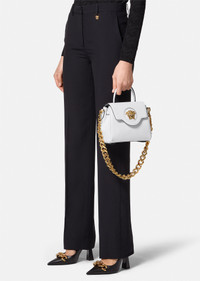 DETAILS Crafted in Italy from premium leather, Versace's latest handbag is adorned with a Medusa plaque – the same décor that was discovered on the doors of the brand's first headquarters in Milan. The slouchy silhouette can be styled on the wrist or across the shoulder, featuring two detachable shoulderstraps: one leather and one chain. - La Medusa plaque - Top handle - Leather shoulder strap - Chain shoulder strap - Magnetic button closure - Flat internal pocket - Outer fabric: 100% Leather - Lining: 100% Leather - Made in Italy Item: DBFI040-DVIT2T_DTU_UNICA_1W00V__ SIZE & FIT - Length: 20 cm - Width: 10 cm - Height: 17 cm - Shoulder straps: min 40, max 50 cm