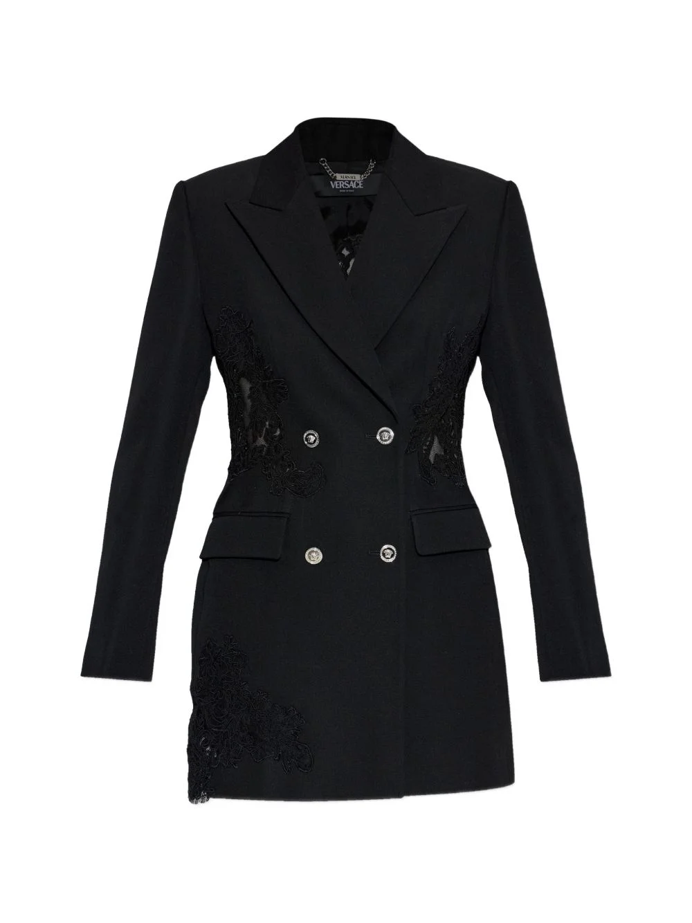 lace double-breasted blazer Highlights - Black - Lace detail - Double-breasted - Flap pockets - Button fastening - Virgin wool Made In Italy Composition Outer: Wool 100% Lining: Viscose 74%, Polyester 26% Washing instructions Read Manufacturer Guidelines