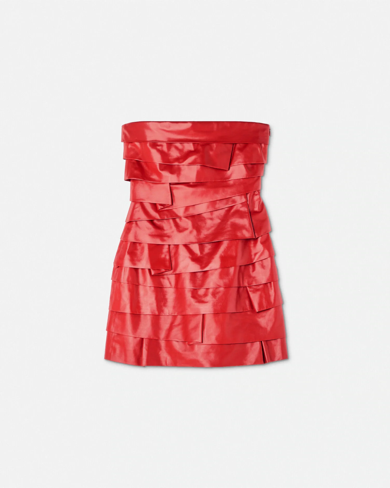 A strapless mini dress fully crafted in soft nappa leather with pleated layered panels and an interior boning corset construction. - Strapless - Concealed side zip closure - Corset construction - Outer Composition: 100% Lambskin - Lining: 100% Cupro Size & Fit - The model is 5'10" / 1.78 m tall and wears size 38 IT Item: 1021665-1A12320_1RD20