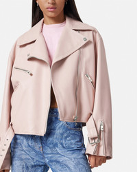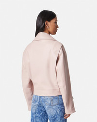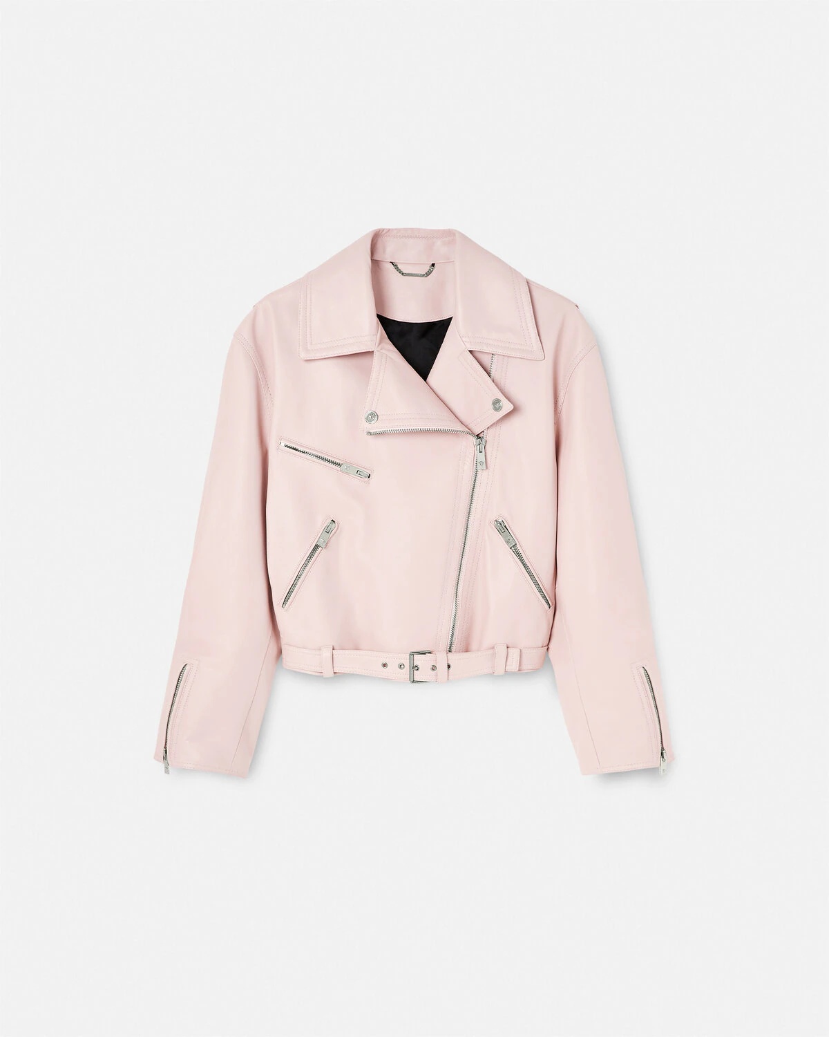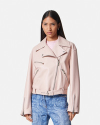 DETAILS This biker-inspired zipped jacket is crafted entirely from leather with a belted waist, accent Medusa hardware, and a jacquard Barocco Silhouette lining. - Medusa hardware - Barocco Silhouette motif lining - Long sleeves - Notched collar - Front zip closure - Side zipped pockets - Belted waist - Zipped cuffs - Outer composition: 100% Lambskin - Lining: 58% Cupro, 42% Viscose - Trim: 100% Calf leather Item: 1010545-1A08926_1PR50 SIZE & FIT - The model is 1,79 m tall and wears size 38 IT