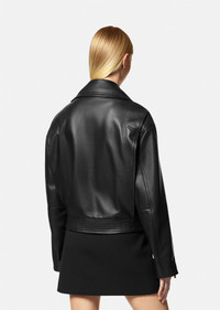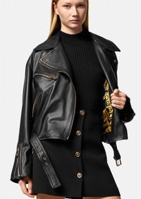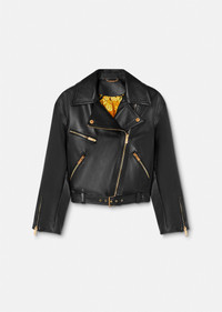 DETAILS This biker-inspired zipped jacket is crafted entirely from leather with a belted waist, accent Medusa hardware, and a Barocco printed lining. - Medusa hardware - Barocco print lining - Long sleeves - Notched collar - Front zip closure - Side zipped pockets - Belted waist - Zipped cuffs - Outer composition: 100% Lambskin - Lining: 100% Polyester - Trim: 100% Lambskin Item: 1010545-1A08403_1B000 SIZE & FIT - The model is 5'8" tall and wears size 38 IT