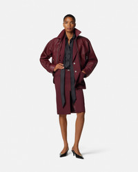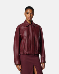 A buffalo leather blouson jacket featuring accent Medusa snap buttons at the cuffs and an elastic waistband. - Medusa hardware - Long sleeves - Pointed collar - Concealed front zip closure - Front snap-buttoned closure - Side zipped pockets - Elastic waistband - Snap-buttoned cuffs - Outer composition: 100% Leather - Lining: 100% Cupro Size & Fit - The model is 5'10" / 1.79 m tall and wears size 38 IT Item: 1022813-1A16885_1RC30