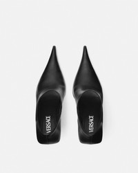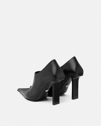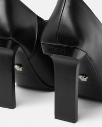DETAILS These lowcut ankle boots with sharp pointed toes are crafted from smooth leather and are set on logoengraved slim square heels in a lacquered finish - Versace logo motif - Slip-on - Ankle-cut - Pointed toe - Slim block heel - Back pull tab - Outer composition: 100% Calf leather - Lining: 100% Lambskin - Sole: 100% Calf leather Item: 1017822-DVT2P_1B00P SIZE & FIT - The shoe weighs approximately 10.5 oz / 0.3 kg for the model size 41 IT - Heel: 4.1" / 10.5 cm - Footbed: slim - Fit is true to size, we recommend taking your normal size
