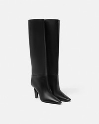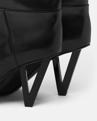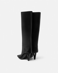 Leather knee-high boots featuring a graphic V-shaped heel. - V2025 heel - Pointed toe - Outer composition: 100% Calf leather - Lining 1: 100% Goat leather - Lining 2: 100% Lambskin - Sole: 100% Calf leather Size & Fit - The shoe weighs approximately 21.2 oz / 0.6 kg for the model size 40 IT - Heel: 3.3" / 8.5 cm - Leg: O7.9" / 20 cm - Footbed: comfortable - Fits true to size, take your normal size Item: 1020550-1A06986_1B000