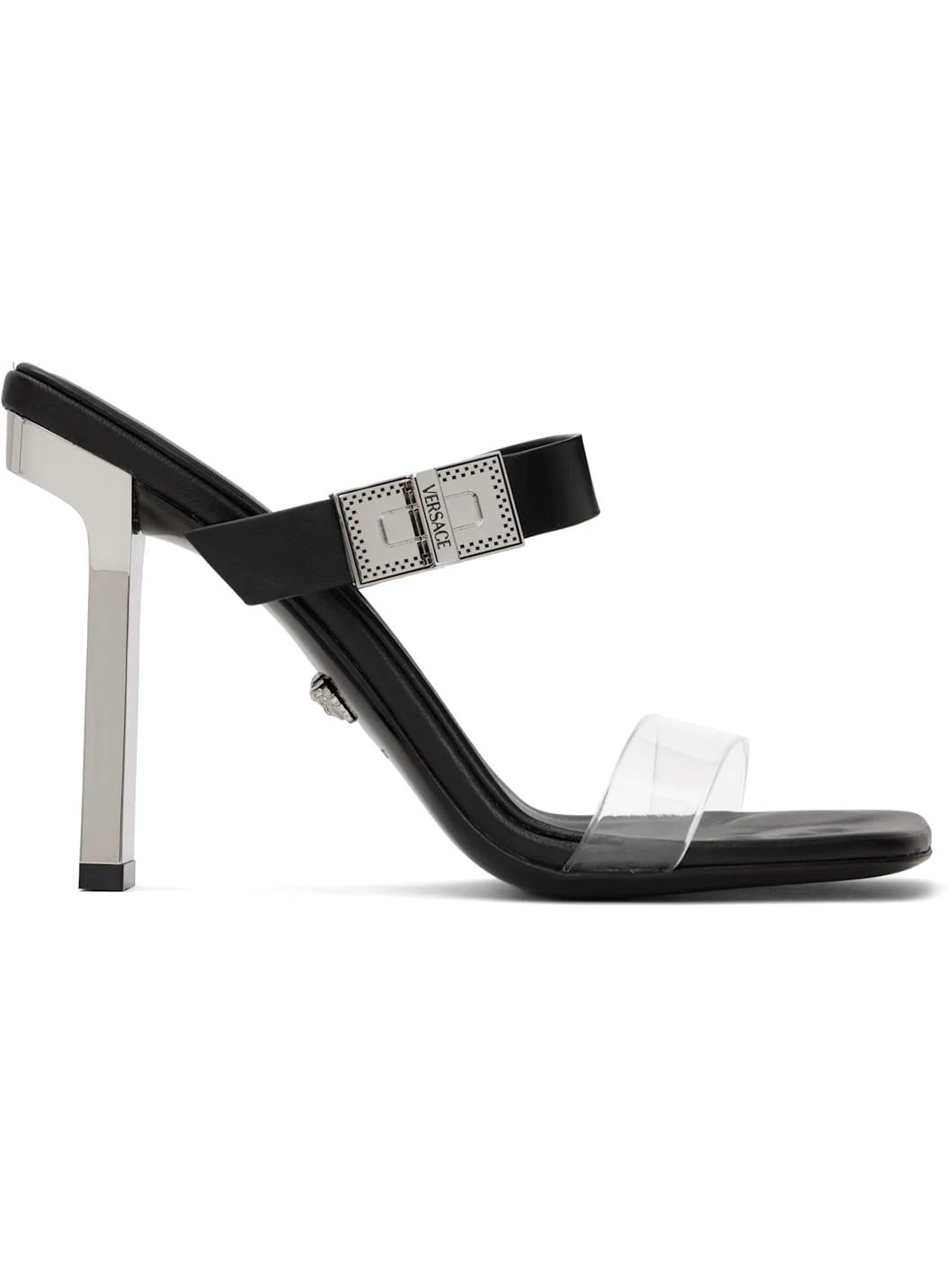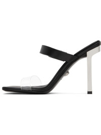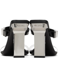 Buffed leather and transparent vinyl heeled sandals in black. · Open square toe · Elasticized strap at vamp · Logo engraved at outer side and heel · Logo printed at padded footbed · Metal block heel with rubber injection · Signature Medusa hardware at leather sole · Heel: H4" Supplier color: Black/Palladium Upper: leather, polyvinyl chloride. Sole: leather, rubber. Made in Italy 242404F125018