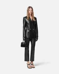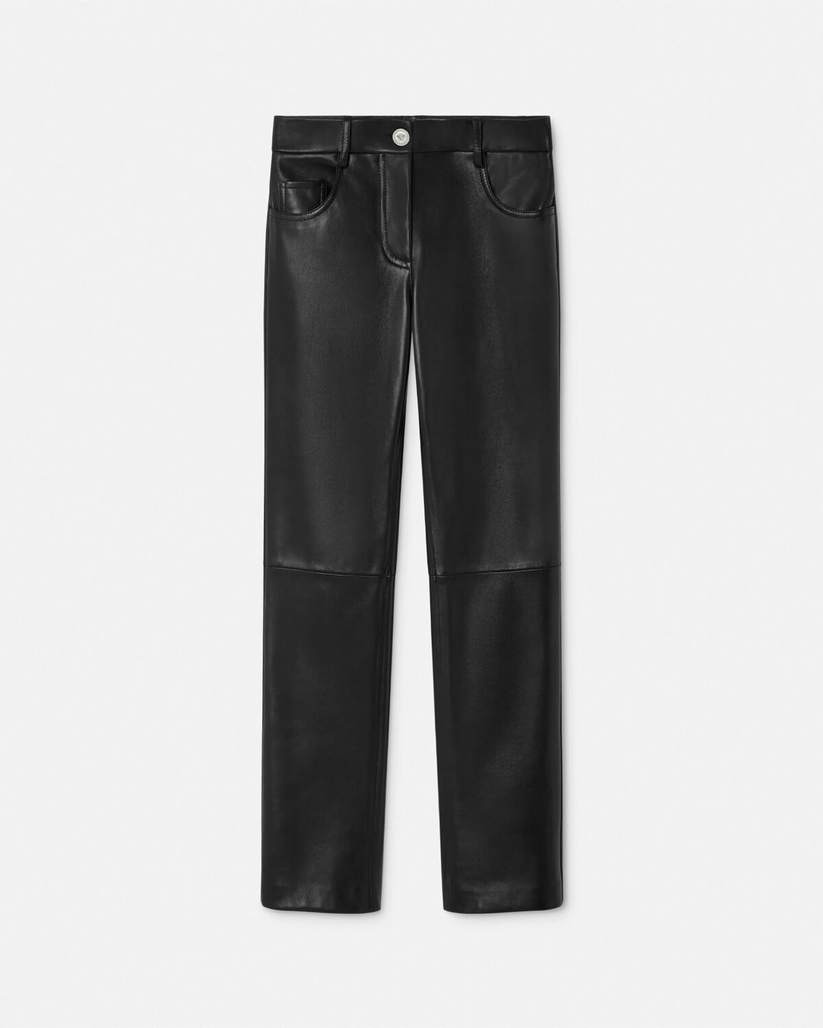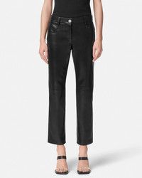 DETAILS Straightleg cropped pants in supple plong nappa leather with a classic fivepocket design accent Medusa hardware and a tonal Versace logo patch at the back - Medusa hardware - Versace logo leather patch - Belt loops - Front button and zip closure - Five-pocket design - Outer composition: 100% Lambskin - Lining: 100% Cupro - Trim: 100% Lambskin Item: 1016779-1A12300_1B000 SIZE & FIT - The model is 5'8" / 1.75 m tall and wears size 38 IT