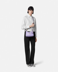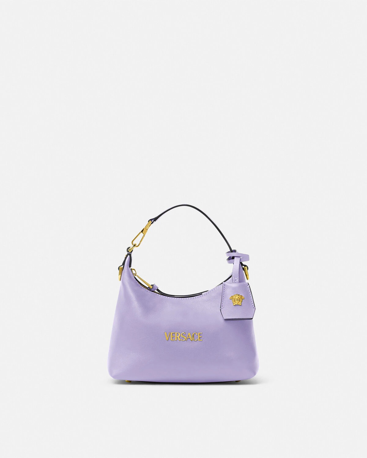 DETAILS The Versace Tag hobo bag is crafted from ultrasoft nappa leather The versatile accessory is accented by metal Versace lettering and can easily be carried inhand by the top handle or crossbody by the detachable and adjustable leather strap A removable leather tag keychain with Medusa hardware completes the design - Medusa hardware - Versace Logo hardware - Top zip closure - Top handle - Adjustable and detachable shoulder strap - Removable keychain tag - Outer composition: 100% Lambskin - Lining: 100% Polyester Item: 1018302-1A13171_1L57V SIZE & FIT - L9" x W6.3" x H4.3" / L23 x W16 x H11 cm - Handle drop:L4.7" / L12 cm - Shoulder strap: L49.2" / L125 cm - Shoulder strap drop: L17.3"-19.7"-22" / L44-50-56 cm - Approximate weight: 10.5 oz / 0.3 kg