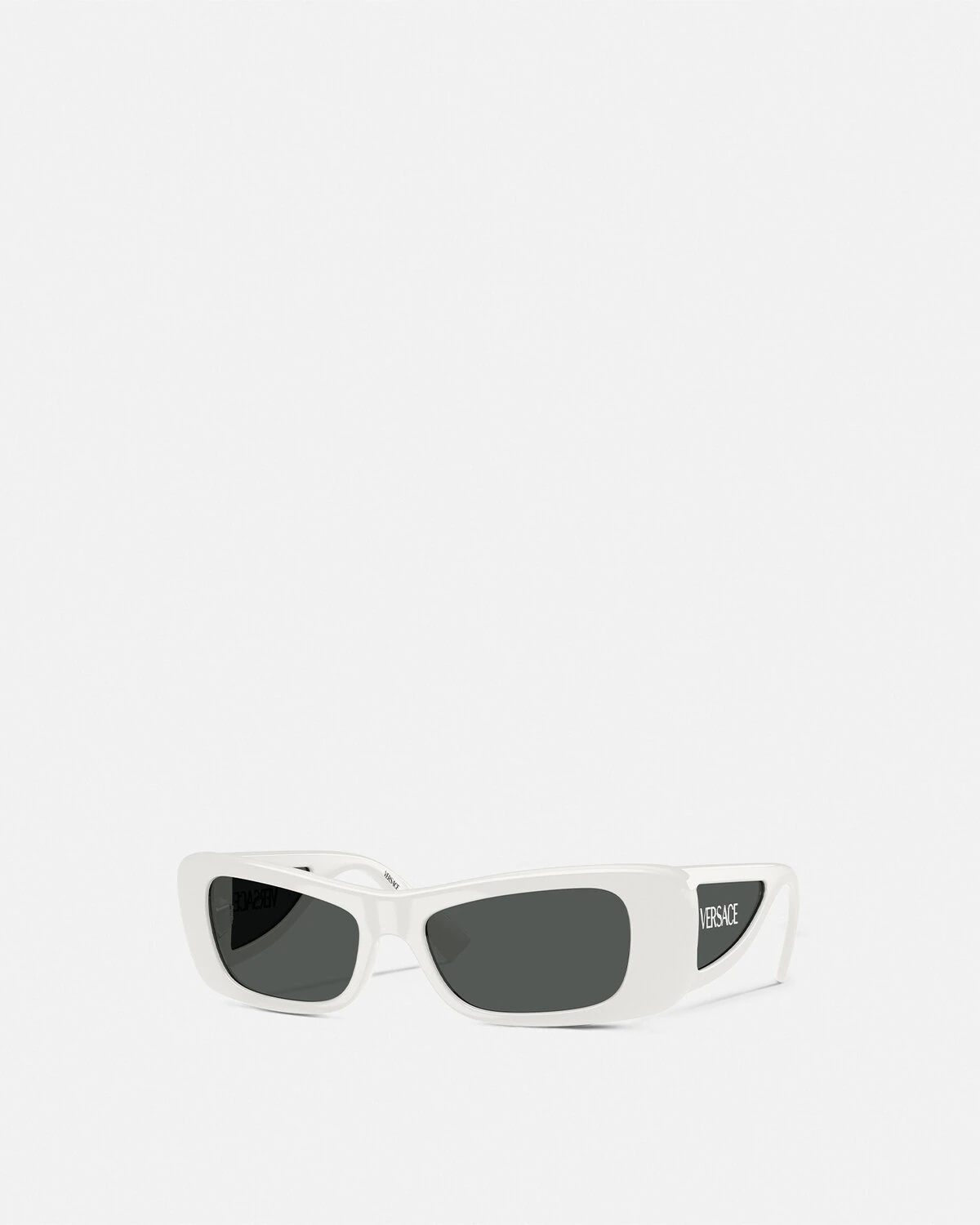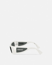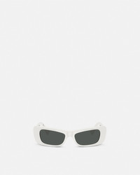 DETAILS A dynamic, soft-rectangular shape, these injected sunglasses are detailed with lens inserts at the wide temples featuring silver-tone metal Versace logo lettering. - Versace Logo motif - Frame color: White - Temple color: White - Lens color: Dark gray - Frame: Injected - Temple: Injected Item: O4481-O3148754_RTU_TU_ONUL__ SIZE & FIT - Lens: W2.1 x H1.3" / W54 x H34.1 mm - Bridge: 0.7" / 17 mm - Temple: 5.3" / 135 mm