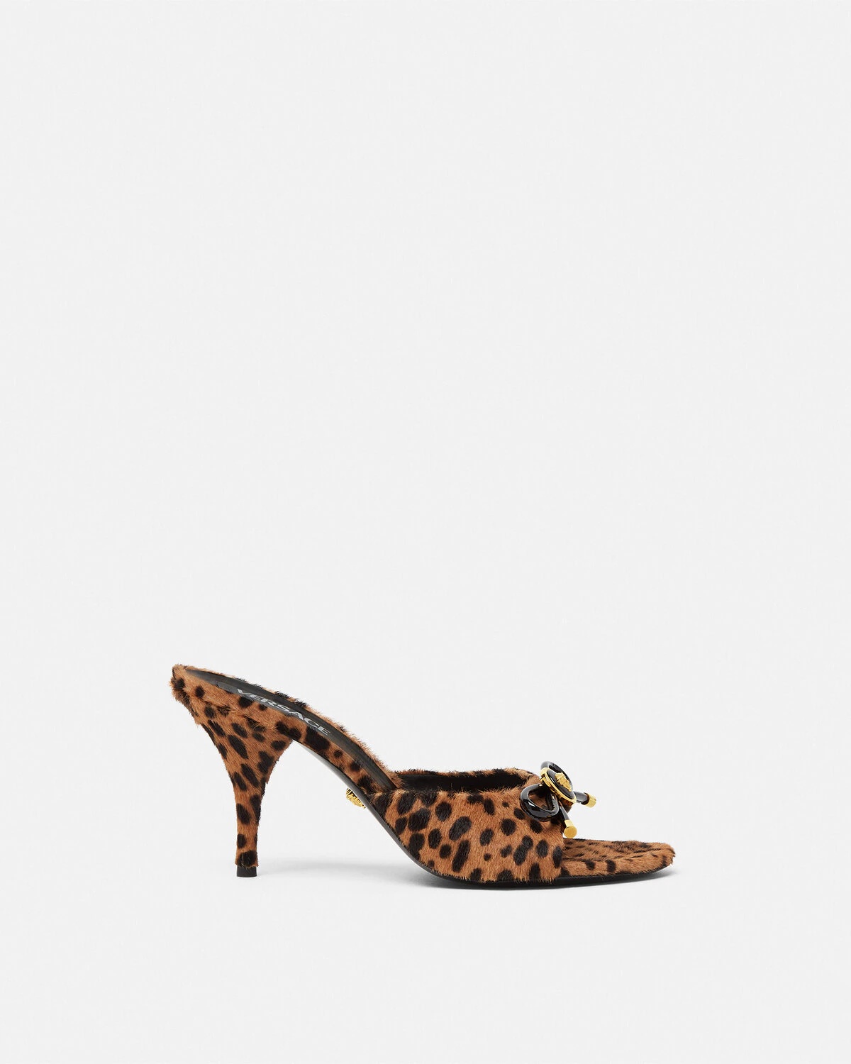 DETAILS These opentoe mules are crafted from soft ponyeffect calf hair Leopard print and feature stiletto heels and a round toe The pair is accented by the iconic enamel Medusa hardware on a reimagined round silhouette of the classic bow detail - Leopard print - Medusa hardware - Round toe - Stiletto heels - Outer composition: 100% Calf leather - Lining 1: 100% Lambskin - Lining 2: 100% Goat leather - Sole: 100% Calf leather - Trim: 100% Calf leather Item: 1018239-1A13307_6N30V SIZE & FIT - The shoe weighs approximately 7.1 oz / 0.2 kg for the model size 40 IT - Heel: 3.3" / 8.5 cm
