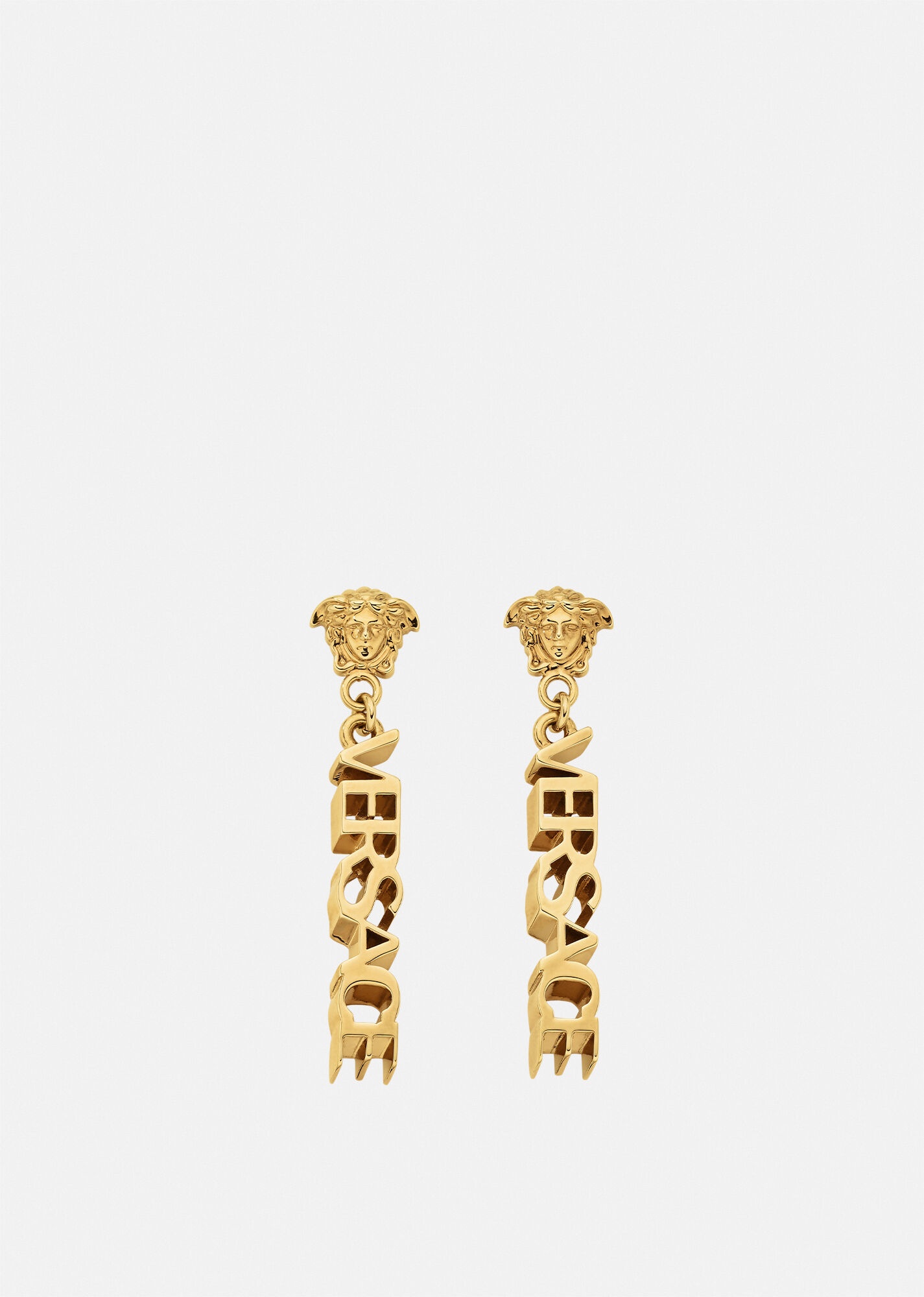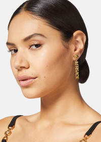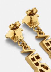 A true representation of brand DNA, these drop earrings feature a Medusa followed by logo lettering. All Versace Jewelry items are lead and nickel free. All materials are hypoallergenic. DETAILS & CARE - Medusa - Logo - Pin and butterfly clasp fastening - For pierced ears only - Metal: Brass - Finish: Versace gold - Please note water or perfume may damage the item SIZE & FIT - Length: 5,54 cm