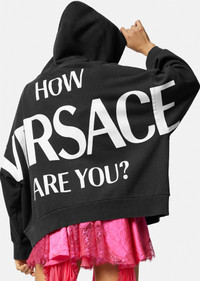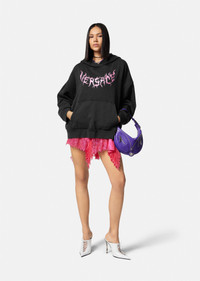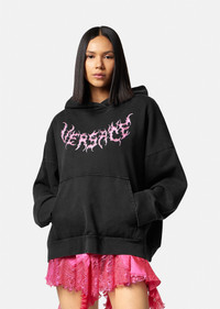 An oversized cotton-jersey hooded sweatshirt in a denim-wash effect, featuring a flaming Versace logo at the front and distressed trims for a grunge Versace edge. DETAILS & CARE - Logo print - Long sleeves - Hood - Kangaroo pocket - Ribbed trims - Distressed detailing - Outer composition: 100% Cotton - Trim: 100% Cotton - Machine wash in water not exceeding 30° (very mild process) - Do not bleach - Do not tumble dry - Cool iron - Do not dry clean - Iron reverse side only - Do not iron decorations SIZE & FIT - All sizes fit Italian standards - The model is 6'0" ft tall