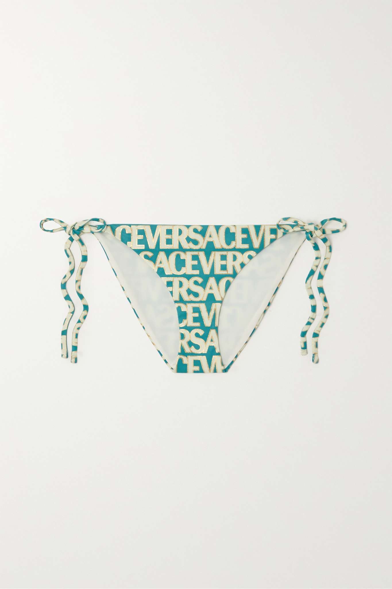 EDITORS'NOTES Versace's bikini briefs are printed with gold-traced versions of the label's repetitive 'Logomania' moniker. They're made from smoothing stretch fabric and have adjustable ties at the side, so you can customize the fit. SIZE & FIT - 1 = XS - 2 = S - 3 = M - 4 = L - 5 = XL - Fits true to size, take your normal size - Mid-rise briefs with medium coverage - Model is 175cm/ 5'9" and is wearing the designer's size 1 DETAILS & CARE - Turquoise, ivory and gold stretch-nylon - Lined at base - 78% nylon, 22% elastane; lining: 88% polyester, 12% elastane - Hand wash - Lotion, sunscreen, oil and chlorine can cause discoloration of this item; this is not a manufacturing defect. Please follow care instructions to keep your swimwear in the best condition