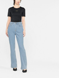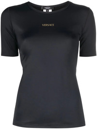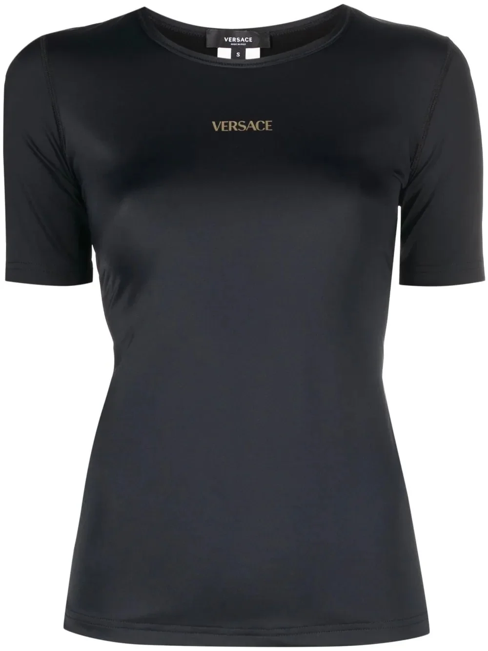 logo-print round-neck T-shirt Crafted with a comfortable stretch design, this round-neck short-sleeved T-shirt from Versace is simply detailed with the brand's logo print at the chest. Made in Italy Composition Outer: Polyamide 78%, Elastane 22% Lining: Polyamide 94%, Spandex/Elastane 6% SIZE & FIT Model measurements Height 5 ft 11 in(1.8 m) Bust/Chest 31.49 in(80 cm) Hips 35.43 in(90 cm) Waist 25.19 in(64 cm) FittingInformation This piece fits true to size. We recommend you get your regular size Cut for a close fit Made with a mid-weight stretch fabric Washing instructions Machine Wash