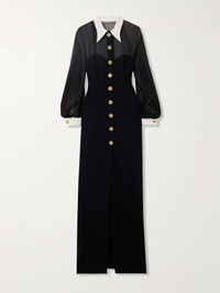 EDITORS'NOTES Versace's shirt dress is destined to impress at your next event. The top is made from silk-chiffon with a contrasting pointed collar and falls to a cady skirt that's cut for a body-skimming fit. Wear yours with elegant heels. SIZE & FIT Model measurements: - Fits true to size, take your normal size - Designed for a close fit - Mid-weight, non-stretchy fabric - Model is 177cm/ 5'10" and is wearing an IT 38 - Bust: 82cm/ 32.5” - Waist: 69cm/ 27” - Hip: 87cm/ 34.5” DETAILS & CARE - Black silk-chiffon, black and white silk-cady - Snap and button fastenings through front - 100% silk; lining: 75% acetate, 25% silk