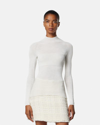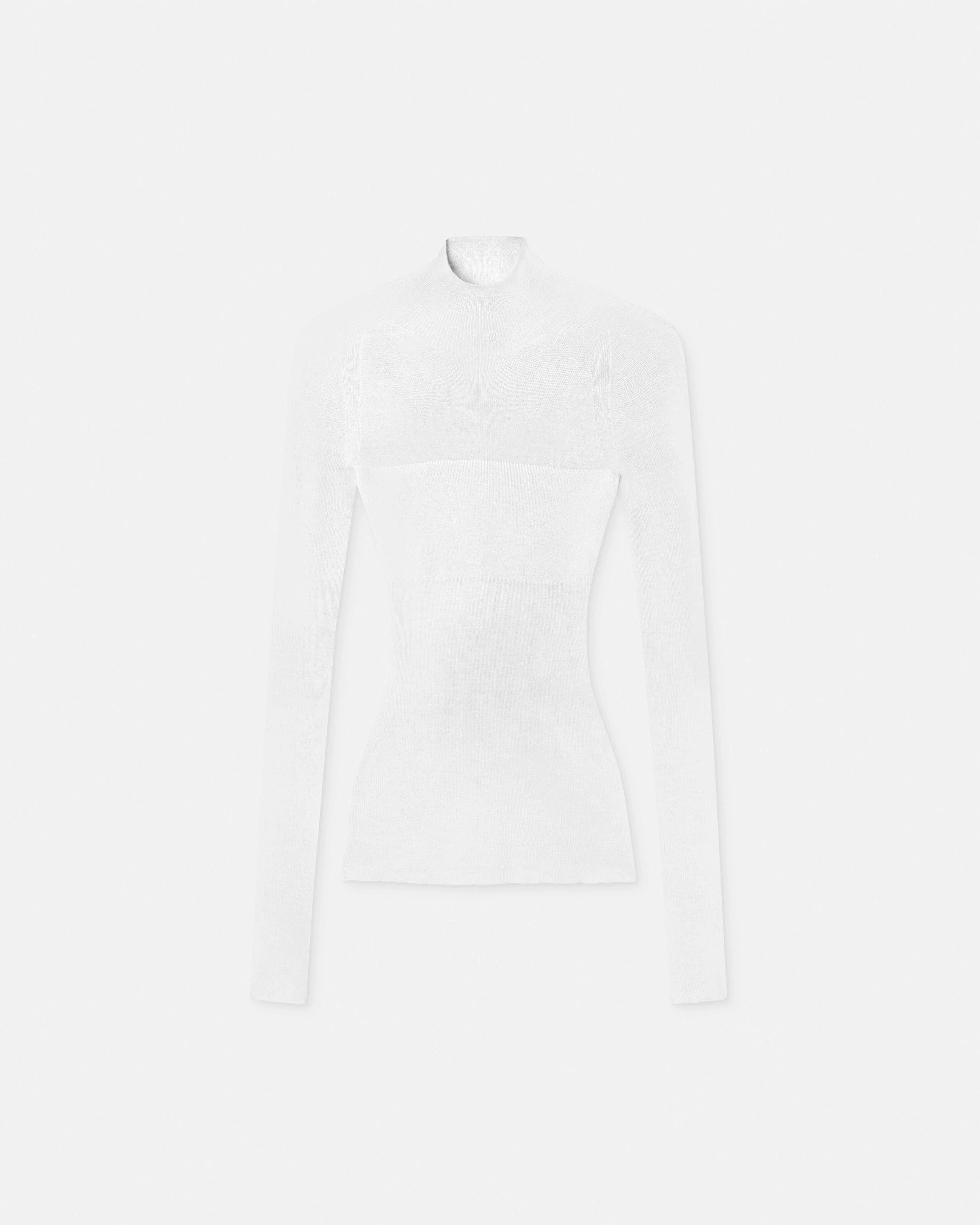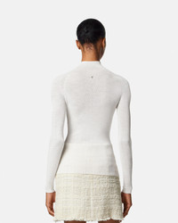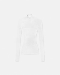 A seamless ribbed-knit top in merino wool with a mockneck and subtle Medusa stud at the back. - Medusa hardware - Long sleeves - Mockneck - Outer composition: 50% Pure Virgin Wool, 49% Nylon, 1% Elastane - Fabric made from recycled nylon Size & Fit - The model is 5'9" / 1.75 m tall and wears size 38 IT Item: 1017241-1A16171_1W010