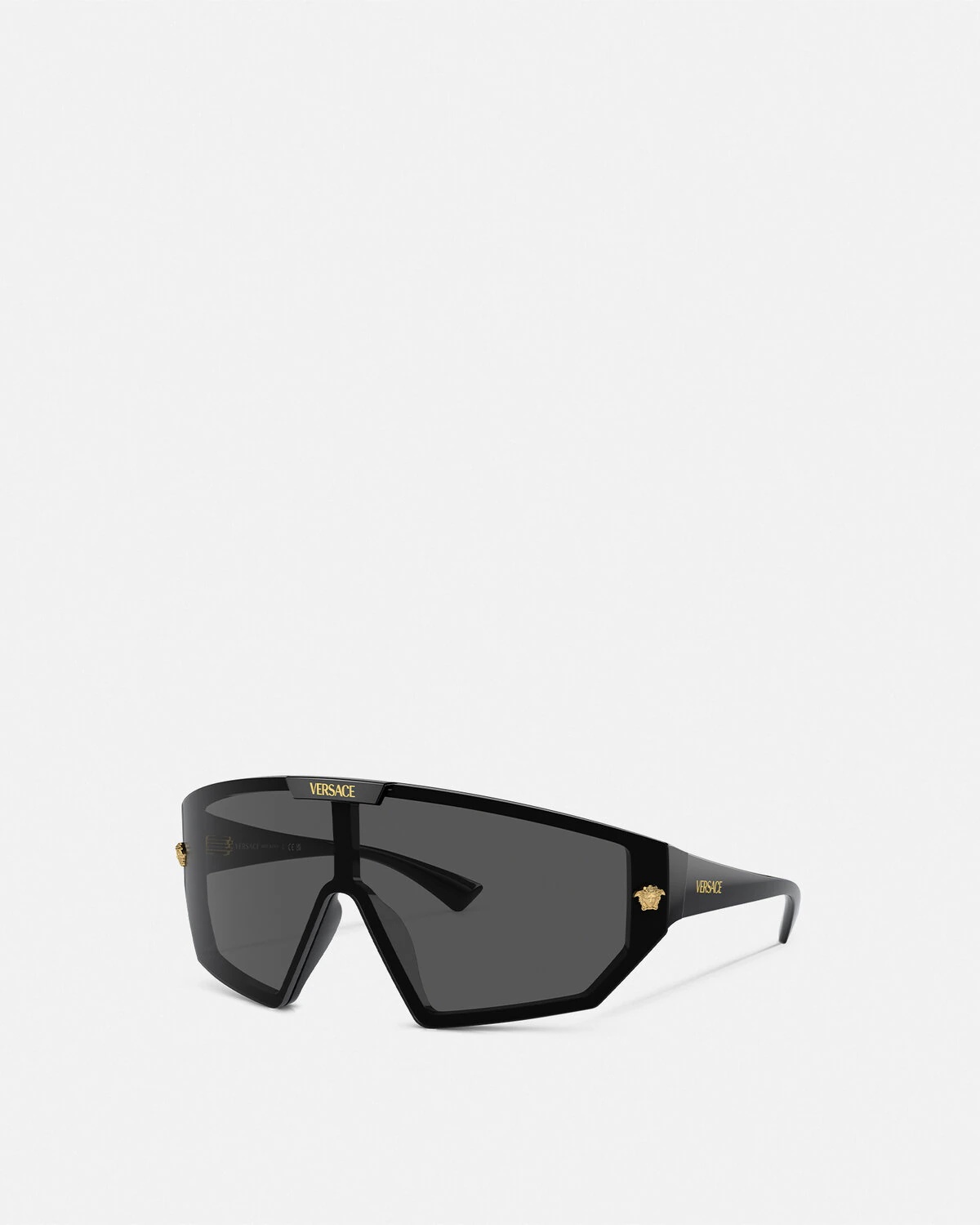 DETAILS These maxi mask sunglasses feature Medusa hardware at the temple hinges and are accented with a logo at the nose bridge. - Medusa hardware - Frame color: Black - Temple color: Black - Lens color: Dark Gray and Gold-tone Mirror - Frame: Injected - Temple: Injected Item: O4461-OGB18747_RTU_TU_ONUL__ SIZE & FIT - Eye size: 1.9"