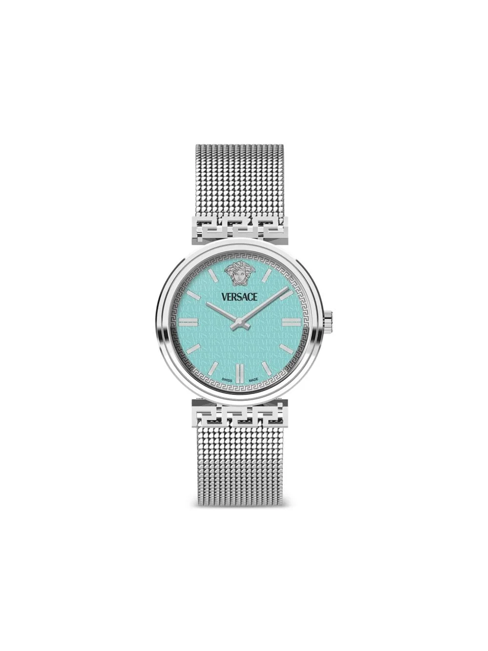 Meander 36mm Highlights - Aqua blue - Stainless steel - Quartz movement - Round face - Index dial - Index hands - Stainless steel case - Screw-down crown - Signature greca detailing - Milanese bracelet - Clasp fastening - This item comes with a standard one-year warranty from the boutique. Imported SIZE & FIT Measurement DIAMETER 1.41 in(3.6 cm) Thickness 0.29 in(0.7 cm) WIDTH 0.7 in(1.8 cm)