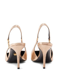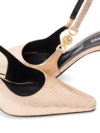 Medusa '95 85mm leather pumps High-octane aesthetics are Versace's calling card, and these pink pumps are exemplary. Crafted from leather to a slingback silhouette, they make a statement thanks to a striking metallic finish and snakeskin effect, as well as the sharpness of their pointed toe and stiletto heel. The slingback strap is anchored by the brand's Medusa '95 plaque, which gives the style its name. Highlights - Rose quartz pink - Calf leather - Snakeskin effect - Metallic finish - Medusa plaque detail - Pointed toe - Elasticated slingback strap - 85mm stiletto heel - Branded leather insole - Leather outsole Made in Italy Composition Outer: Calf Leather 100% Lining: Calf Leather 100% Sole: Calf Leather 100%