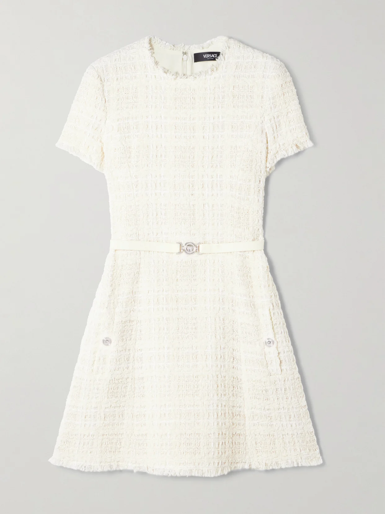 Versace's dress is made from cotton-blend tweed that's flecked with metallic threads for subtle light-reflecting finish. It features the signature 'Medusa' motif on the waist-defining belt and enamel buttons. Frayed trims outline the neckline, short sleeves and floaty hem. Large to size. See Size & Fit notes.
