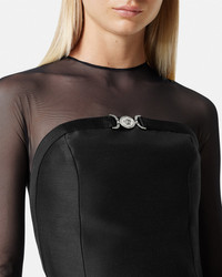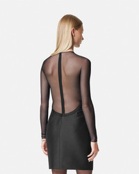 DETAILS This midi dress made from wool and silk blend has a folded structural hip volume Medusa 95 hardware sheer mesh sleeves and plunging back inserts finish the piece with nastro Gianni satin trims - Medusa '95 hardware - Long sleeves - Round neckline - Concealed zip closure - Outer composition 1: 77% Wool, 23% Silk - Outer composition 2: 82% Nylon, 18% Elastane - Lining: 100% Silk - Trim: 74% Acetate, 26% Viscose Item: 1013420-1A09075_1B000 SIZE & FIT - The model is 5'8" tall and wears size 38 - All sizes fit Italian standards