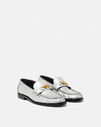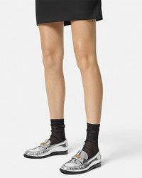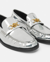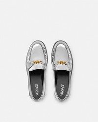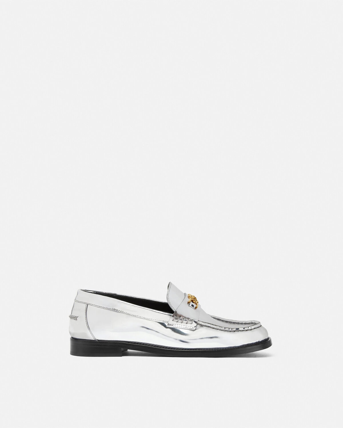 DETAILS These slip-on leather loafers have a polished metallic finish and the Medusa '95 detail at the penny strap – a House signifier that first debuted in the mid '90s. - Medusa '95 hardware - Slip on - Round toe - Penny strap - Flat stacked heel - Outer composition: 100% Calf leather - Lining 1: 100% Lambskin - Lining 2: 100% Goat leather - Sole: 100% Calf leather Item: 1012123-1A04302_1E01V SIZE & FIT - The shoe weighs 10.6 oz for the model size 37 - All sizes fit Italian standards - Fits true to size, take your normal size - Heel: 0.8"
