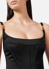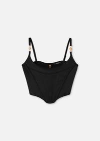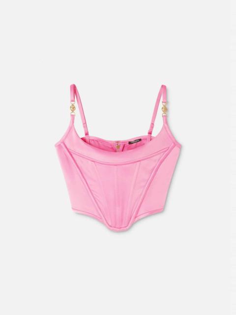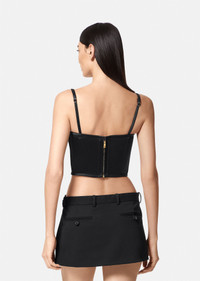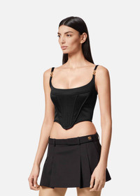 DETAILS A reworking of the signature Atelier Versace corset, this top is cinched at the waist with V-shaped boning that accentuates the form. The cropped style is crafted in an elegant satin finish with Medusa hardware at the shoulder straps. - Medusa hardware - Corset construction - Sleeveless - Adjustable shoulder straps - Scoop neckline - Back zip closure - Hook and eye closure - Outer Fabric: 74% Acetate, 26% Viscose Item: 1006669-1A00540_1B000 SIZE & FIT - The model is 5'8" tall and wears size 38 IT