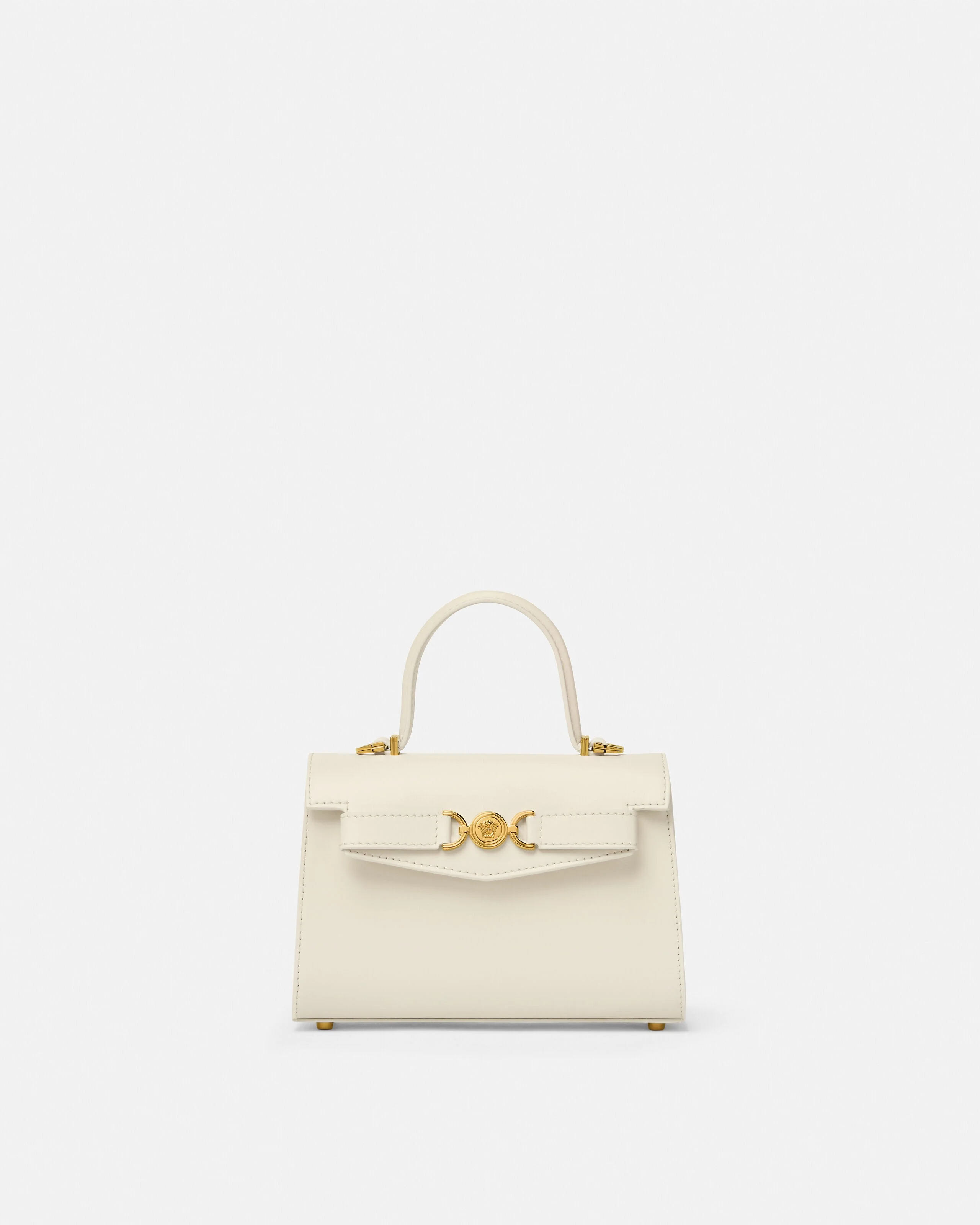 A small handbag with belt detail featuring the Medusa '95 hardware, the iconic House code first seen in the 1995 collections. The top handle design is made from smooth, flat-grain leather with a magnetic foldover flap and a detachable crossbody shoulder strap. - Medusa '95 hardware - Versace logo embossing - Top handles - Foldover magnetic closure - Two internal slip pockets - Detachable shoulder strap - Metal feet - Outer composition: 100% Calf leather - Lining: 100% Lambskin Size & Fit - L8.3" x W3" x H5.9" - Strap: L39.3"-42.5" - Drop: L3.3" - Approximate weight: 14.1 oz Item: 1013824-1A10795_DTU_UNICA_1KC0V__