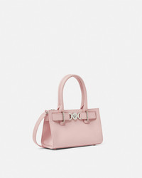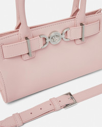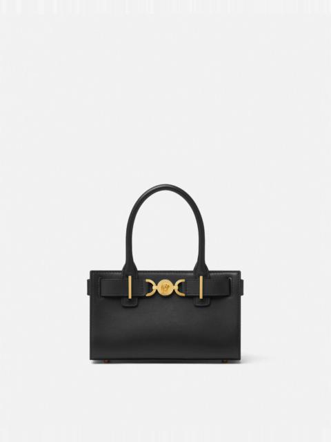 DETAILS Horizontal tote bag with belt detail featuring the Medusa '95 hardware, the iconic House code first seen in the 1995 collections. The top handle design is made from smooth, flat-grain leather with magnetic closure and has a detachable crossbody shoulder strap. - Medusa '95 hardware - Versace logo embossing - Top handles - Open top - Magnetic closure - Internal slip pocket - Detachable shoulder straps - Metal feet - Outer composition: 100% Calf leather - Lining: 100% Lambskin Item: 1013169-1A10795_DTU_UNICA_1PT2P__ SIZE & FIT - L9.1" x W3.1" x H5.5" - Strap: L36"-39" - Drop: L4.7" - Approximate weight: 17.6 oz